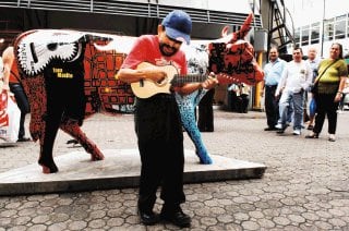Durante los cuatro meses en que las 120 esculturas del Cow Parade se exhibieron en la ciudad capital, el famoso personaje josefino conocido como Marito Mortadela custodió una obra en particular, a la que llamó “su” vaca.