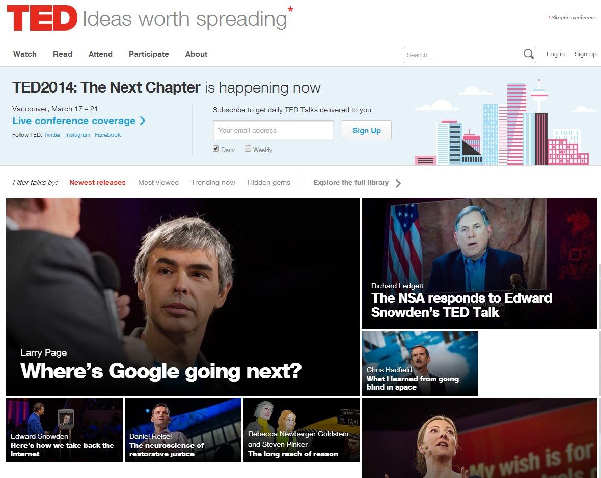 En 2006, TED comenzó a grabar las charlas y difundirlas gratuitamente en Internet en su web TED.com. La web fue recientemente renovada para permitir a los espectadores ahondar en las ideas y tomar acción.