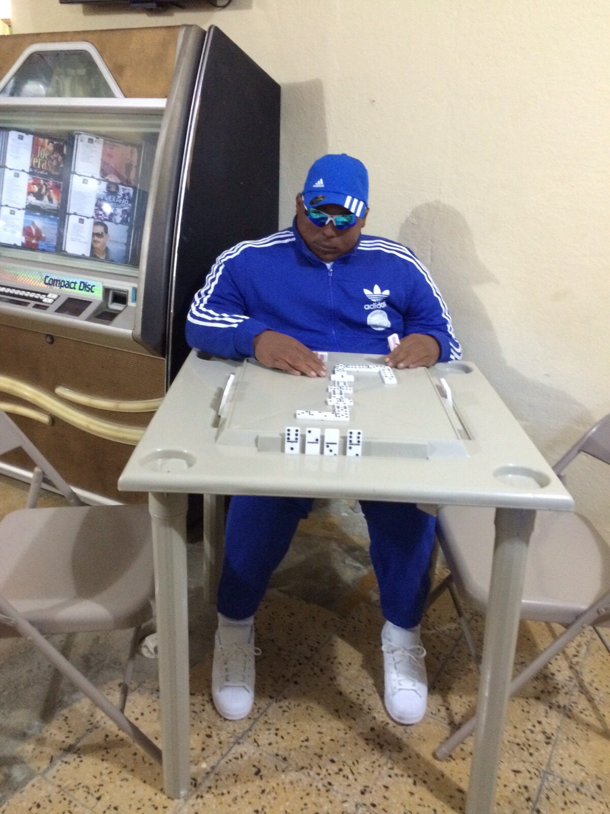 El joven aparece sentado en una de las mesas del bar, en la que se colocaron fichas de dominó, una gran botella de cerveza y una cajetilla de tabaco.