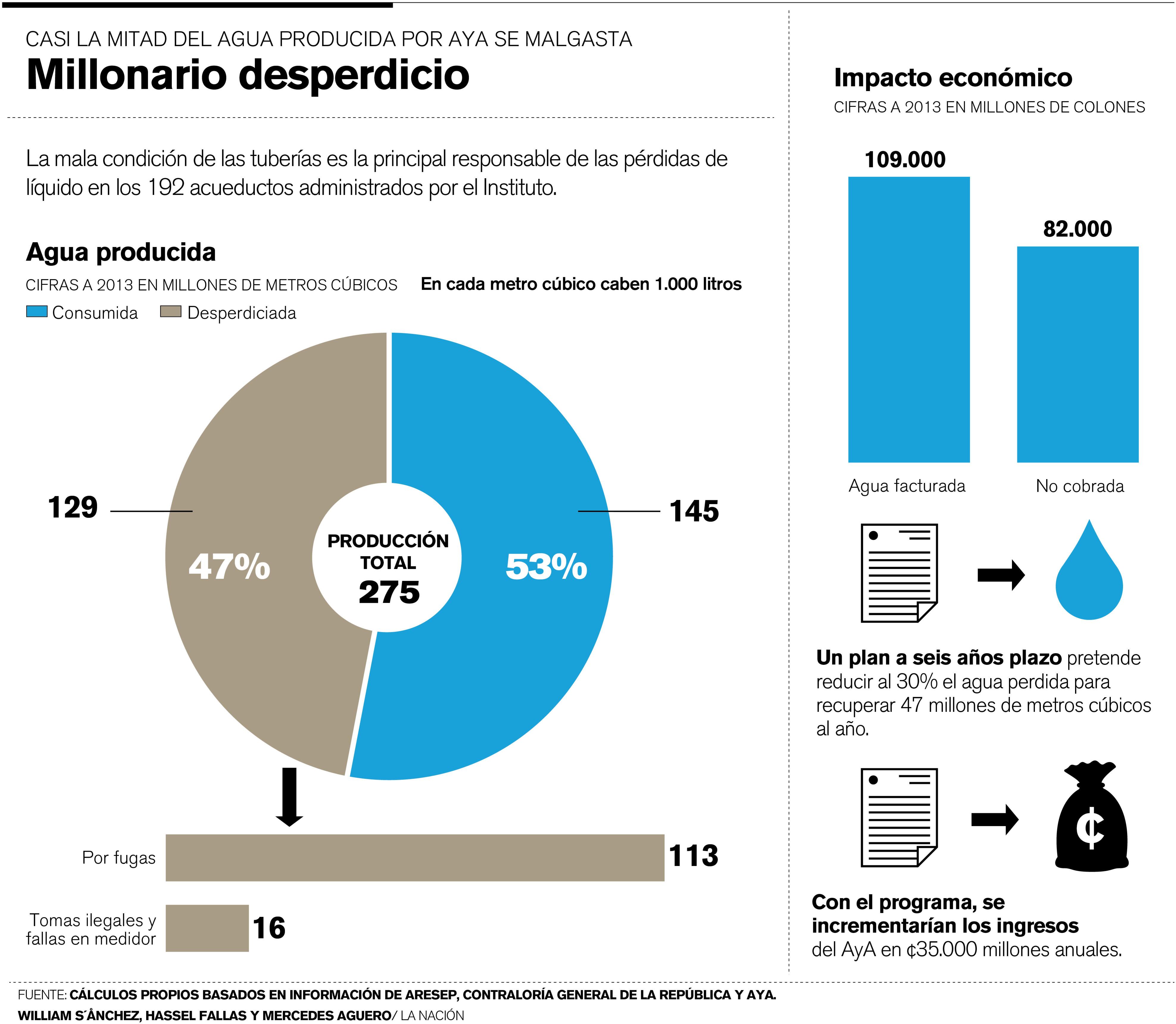 Solo en el 2013, la entidad perdió unos ¢82.000 millones por agua producida, pero no vendida. Cada metro cúbico (1.000 litros) tiene un costo de producción promedio de ¢636.