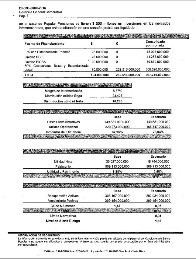 “En esa misma línea, cabe indicar que los supuestos no tienen respaldo técnico o histórico del propio banco o de otro similar y es un escenario que no se ha observado en el Sistema Financiero Nacional para una entidad en estado normal”, redactó Cascante en el oficio SGF-2870-2016-SGF Confidencial, del 5 de setiembre del 2016.