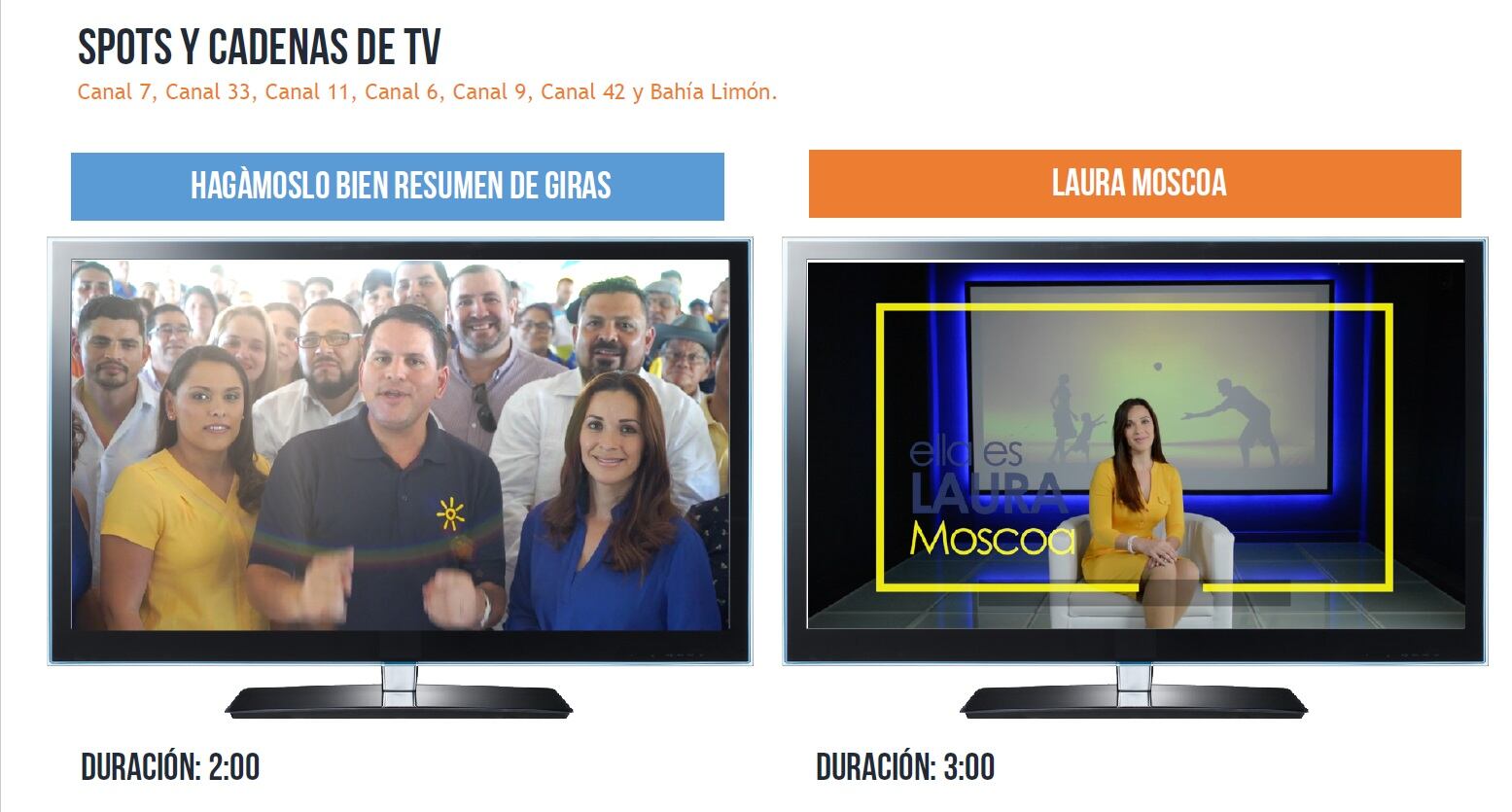 -Cuatro cadenas de televisión que se transmitieron en Canal 7, Canal 33, Canal 11, Canal 6, Canal 9, Canal 42 y Bahía Limón, cuyo costo es de $120.000 (¢69 millones).