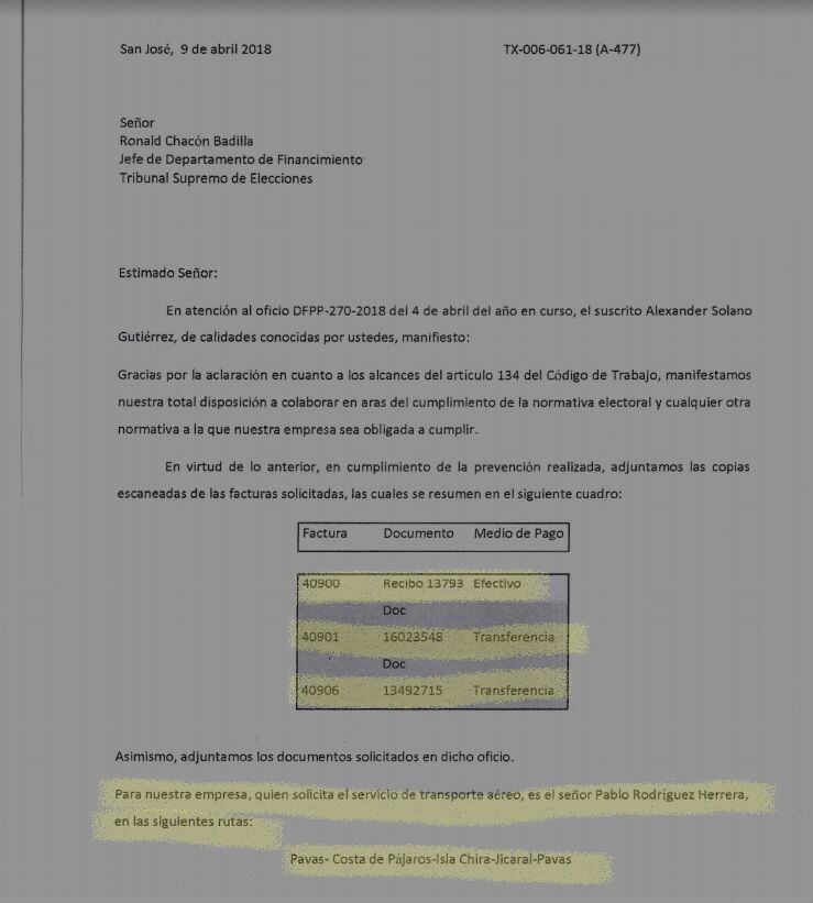 “Dos de las facturas por servicios aéreos, reportadas como donaciones por Paulo Rodríguez Herrera, fueron realizadas mediante transferencias bancarias de cuentas a nombre de dos personas jurídicas nacionales, situación que corroboraría la hipótesis sobre la intención de ocultar las evidencias para borrar el rastro de la donación ilegal a través de la figura del señor Paulo Rodríguez”, señaló el TSE en el relato de los hechos.