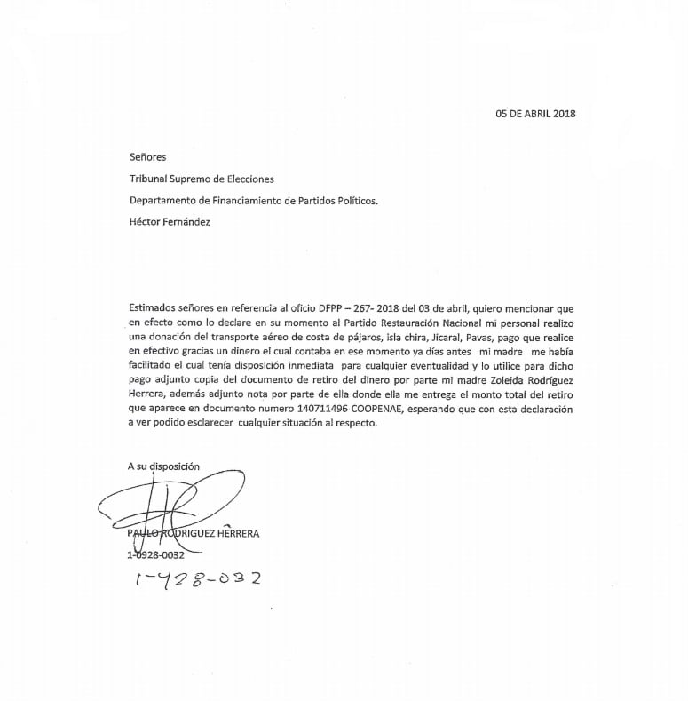 “Quiero mencionar que en efecto, como lo declaré en su momento al PRN, mi persona realizó una donación de transporte aéreo de Costa de Pájaros, isla Chira, Jicaral, Pavas. Pago que realicé en efectivo, gracias a un dinero del cual contaba en ese momento, ya que días antes mi madre me había facilitado, el cual tenía disposición inmediata para cualquier eventualidad y lo utilicé para dicho pago, adjunto copia del documento de retiro del dinero por parte de mi madre”, declaró Rodríguez en una nota que lleva su nombre, firma y número de cédula.