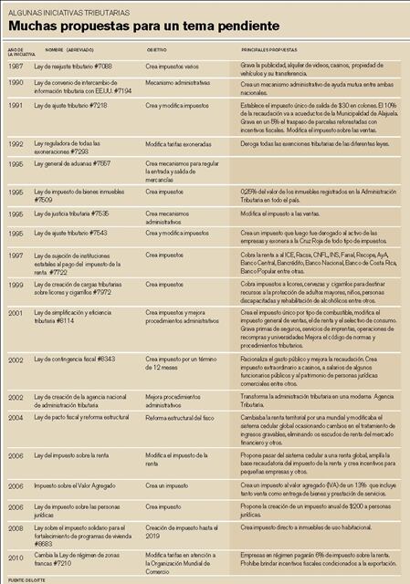 Las últimas dos iniciativas de este tipo se presentaron durante la pasada administración Arias, que en el 2006 llevó al Congreso el proyecto de ley para crear el Impuesto al Valor Agregado (IVA) y el del Impuesto sobre la Renta, que intentaba cambiar el actual sistema cedular por uno de renta global, que ampliaría la base recaudatoria.