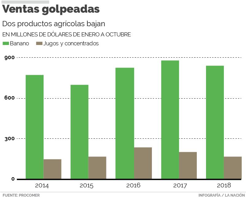 En el caso de los jugos y concentrados de frutas (incluye en especial de naranja y de piña) las ventas en ese periodo cayeron 18% en su valor, pues pasaron de $201 millones, entre enero y octubre del 2017, a $165 millones en igual periodo del año pasado, según las estadísticas de Procomer.