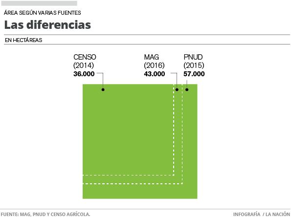 Mientras el Censo Nacional Agrícola del 2014, realizado por el Instituto Nacional de Estadística y Censos (INEC), detectó 36.000 hectáreas dedicadas a la siembra de esa fruta, el Ministerio de Agricultura y Ganadería (MAG) estima en 43.000 las hectáreas cultivadas al 2016, de acuerdo con el informe anual de la Secretaría Ejecutiva de Planificación Sectorial Agropecuaria (Sepsa).