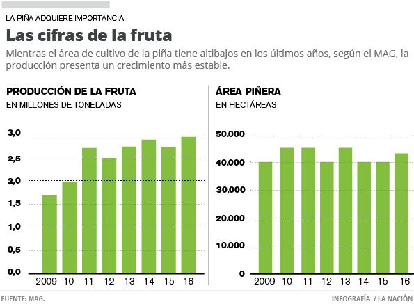 La piña se convirtió en un negocio importante para Costa Rica. De acuerdo con los datos de la Promotora del Comercio Exterior (Procomer), el valor de las exportaciones de la fruta fue de $773 millones en el 2012 y se elevó a $875 millones el año pasado. Esa cifra colocó esta fruta como segundo producto de exportación, detrás del banano, en el 2016.