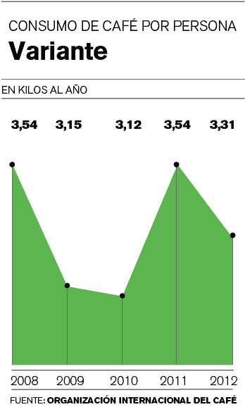 De acuerdo con datos de la Organización Internacional del Café (OIC), el consumo por persona al año en Costa Rica fue de 3,54 kilos en el 2008, luego bajó a 3,12 kilos en el 2010, tuvo un repunte y volvió a caer a 3,31 kilos en el 2012 (último disponible).