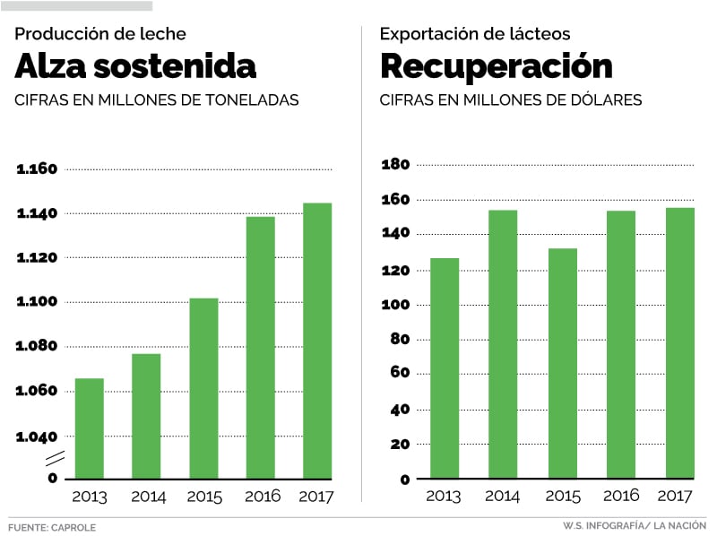 En el 2010, Costa Rica logró una producción de 953 millones de toneladas métricas de leche, cifra que ya estaba en 1.015 millones de toneladas en el 2012 y que el año pasado cerró en 1.144 millones.