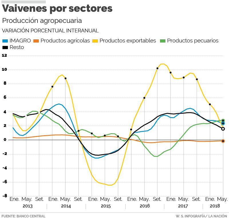 Esa dependencia se debe a que el rubro denominado “productos agrícolas”, donde se incluye la producción de granos, hortalizas y otros más destinados a consumo interno, prácticamente se ha mantenido estancando desde enero del 2013, incluso con números negativos desde el inicio del 2016, conforme con el comportamiento del Imagro.
