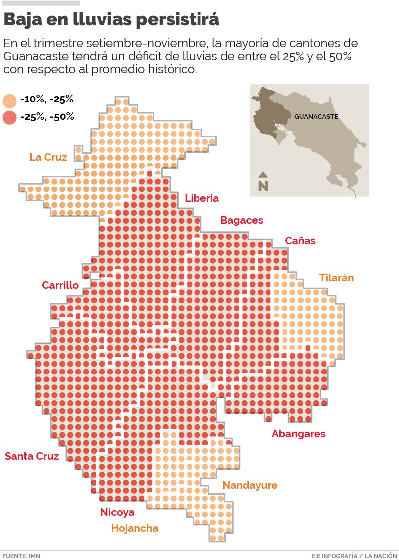 La estadística del Instituto indica que para Liberia se presentó un déficit de 40% en las precipitaciones con respecto al promedio histórico, entre enero y agosto. En La Cruz, la baja fue del 29% en ese periodo; en Nicoya del 26%; en Carillo del 15%; en Bagaces del 18%, y en Nandayure del 8%.