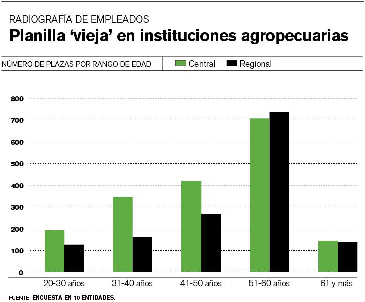 El 53% de los funcionarios de las 10 instituciones públicas del sector agropecuario alcanzará la edad para pensionarse en los próximos 10 años, lo cual abriría 1.727 plazas en esas entidades, de acuerdo con datos de una encuesta realizada en esa población.