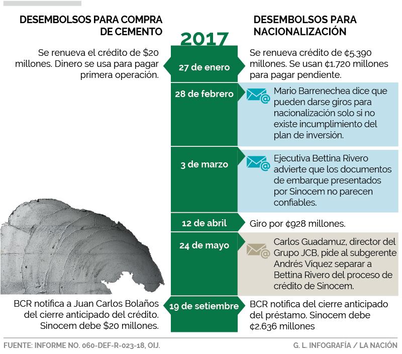 Por ejemplo, se enfatiza que el segundo desembolso de dinero se hizo sin que Bolaños hubiera cumplido con cancelar lo correspondiente al primer mes de ventas de Sinocem. Empero, el aval se dio luego de la autorización de los subgerentes Andrés Víquez y Leonardo Acuña.