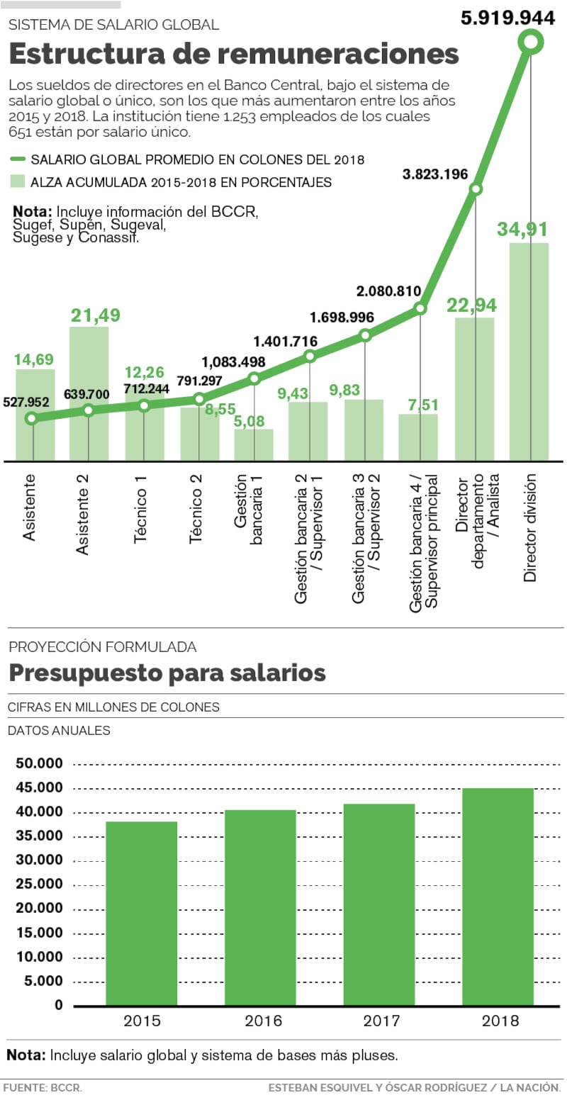 En el caso de los 34 directores de departamento del BCCR y las superintendencias, reportan un sueldo promedio al mes de ¢3,8 millones, es decir, un aumento del 23% en cuatro años, según los datos brindados por el Banco Central.