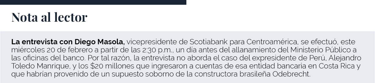 El 8 de febrero, Scotiabank anunció la venta de sus operaciones en El Salvador. Diego Masola, vicepresidente ‘senior’ de Scotiabank para Centroamérica, estuvo a cargo de dicha negociación con el Banco Cuscatlán.