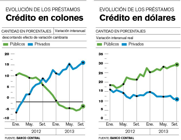 La cartera de créditos en dólares de los bancos públicos, con corte a setiembre pasado, creció en un 29,4% respecto del mismo mes del año pasado. En los bancos privados el incremento para el mismo periodo fue de un 11,1%.
