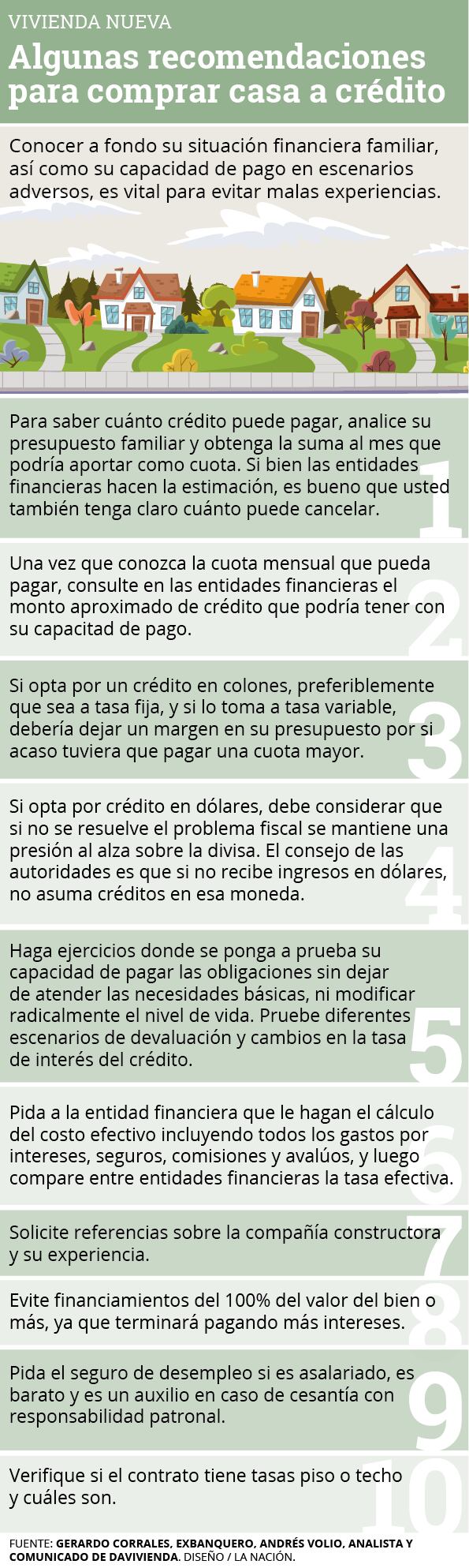 "Se debe evitar los créditos de tasa ajustable y por supuesto el riesgo cambiario. Además, antes de decidir, es indispensable hacer ejercicios donde se ponga a prueba la capacidad de pagar las obligaciones, sin dejar de atender las necesidades básicas, ni modificar radicalmente el nivel de vida, ante diferentes escenarios de devaluación y cambios en la tasa de interés del crédito", comentó Volio.