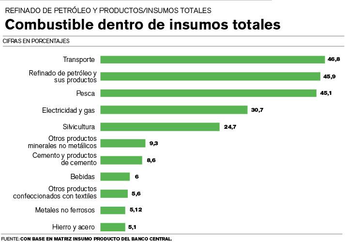 Según los datos obtenidos de la matriz insumo producto 2011 que calculó el Banco Central, entre las actividades en las cuales el petróleo refinado y sus productos son un ingrediente importante en la producción, hay algunos regulados por ley, como el transporte y la electricidad, y otros no regulados.