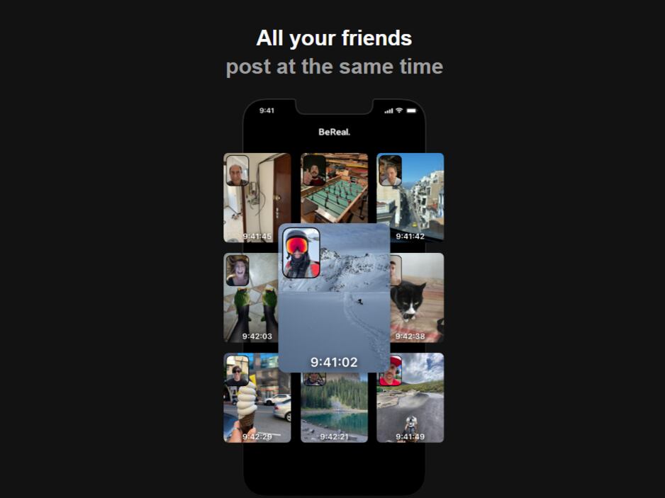 Las publicaciones se cuelgan en un muro, en el que se pueden observar las imágenes de amigos o explorar las fotografías de otras personas. BeReal también permite enviar solicitudes de amistad, pero carece de la función de enviar mensajes privados.