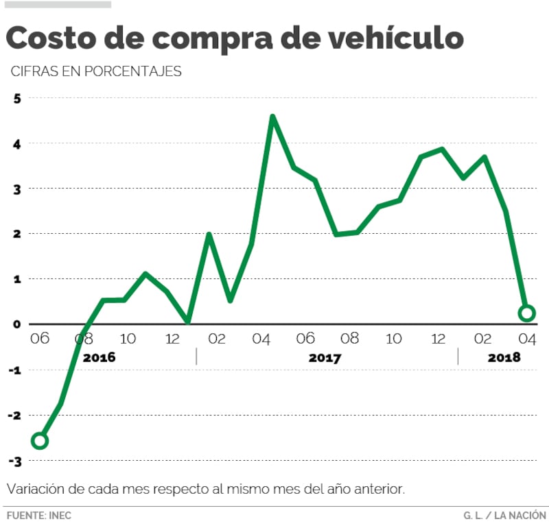 En el caso de autos nuevos, el índice de precios de “automóvil”, que calcula el Instituto Nacional de Estadística y Censos, muestra que el costo de adquisición de autos nuevos se ha desacelerado a tal punto que en mayo casi no creció respecto al mismo mes del año pasado.