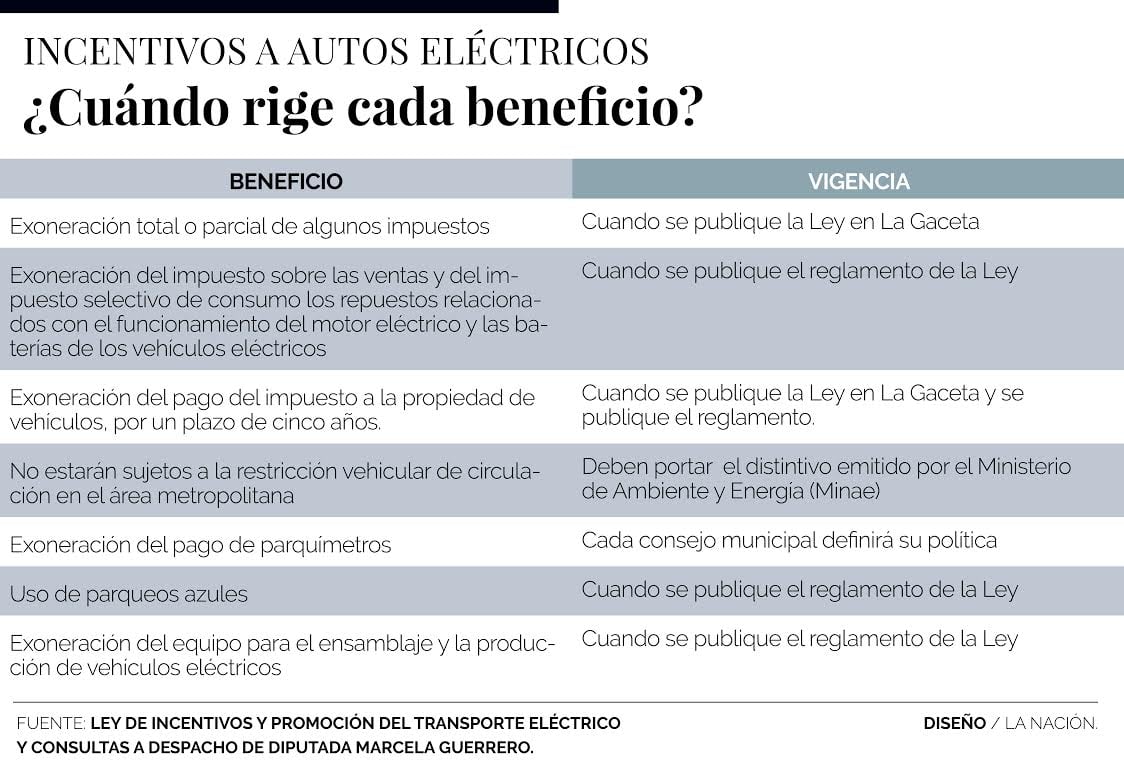 Todos los otros beneficios, como la exoneración en los repuestos, al impuesto a la propiedad de vehículos y los parqueos azules, están sujetos al reglamento de la ley o algún trámite previo, según se detalla en la legislación y en la consulta al despacho de la diputada Marcela Guerrero, una de las impulsoras del proyecto.