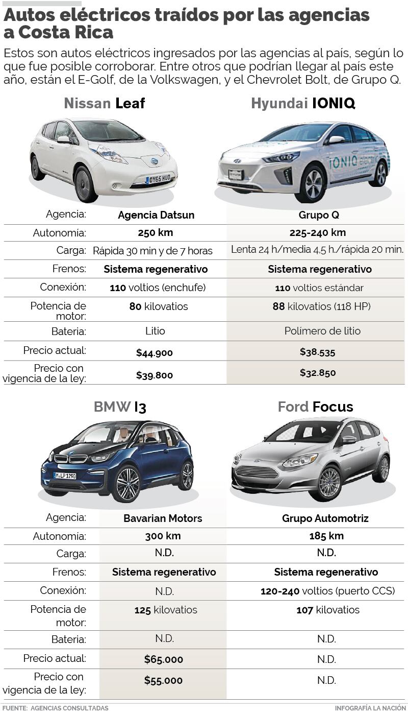 Se trata de Grupo Q con sus modelos Ioniq (que ya está para probar en Costa Rica) y Chevy Bolt (que vendrá nuevo); de Agencia Datsun con el Nissan Leaf, que ya hay dos de prueba aquí; BMW con el I3, que ya circula en el país y Grupo Automotriz, el cual traerá los dos primeros Ford Focus esta semana.