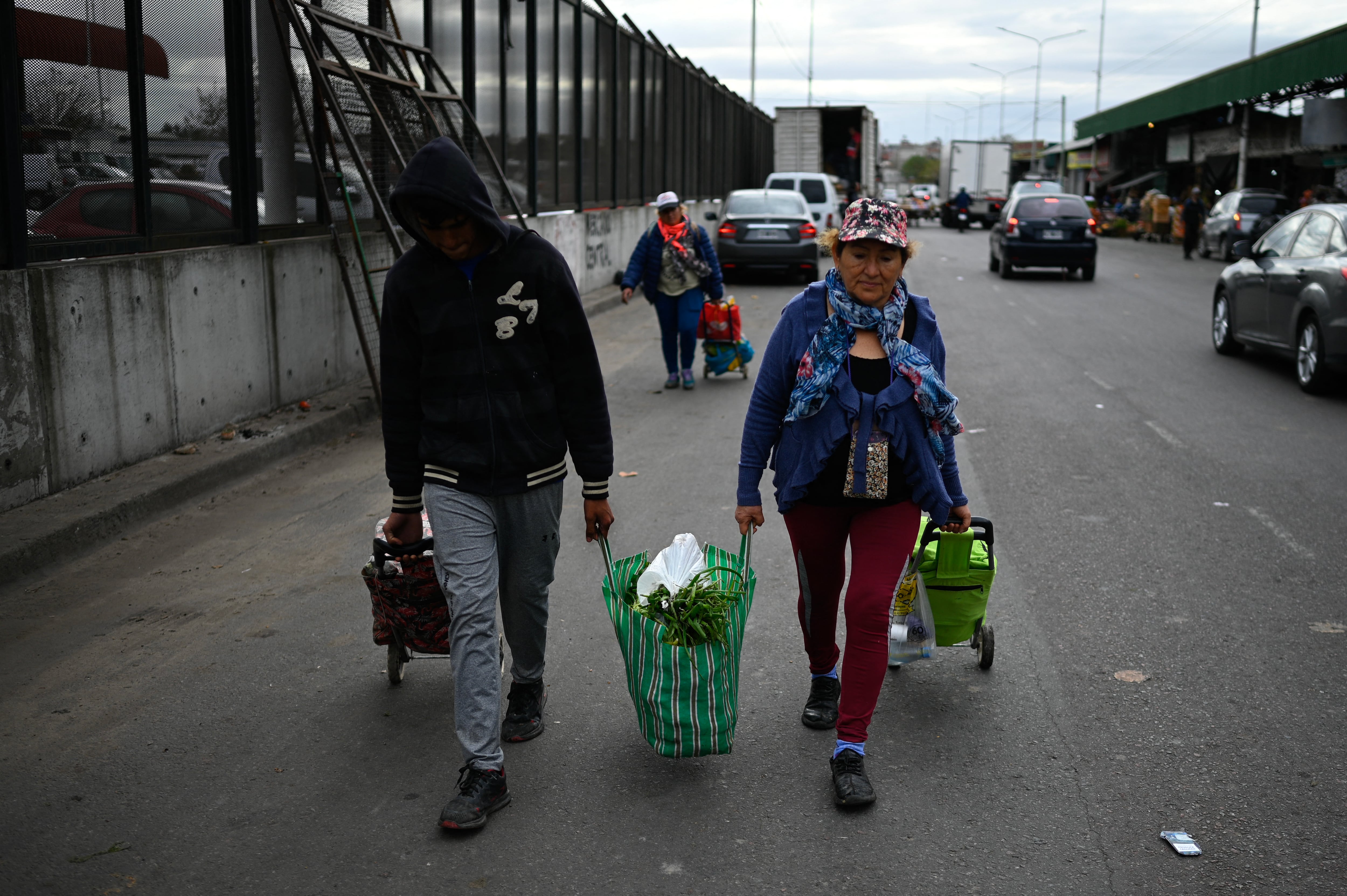 Vecinas en las afueras de Buenos Aires, estas dos mujeres recorren semanalmente desde hace dos años un trayecto de 20 kilómetros, en tren y en autobús, con su carrito de compras y dos bolsas cada una. “Yo me compraba dos tomatitos por 500 pesos ($2) y acá me llevo gratis dos o tres kilos, para una o dos semanas”, contó Benítez, una empleada doméstica de 59 años.