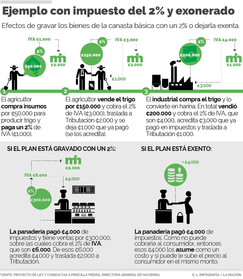 ¿Podría subir más el precio si la canasta está exenta que si se le aplica al precio un 2%? Podría pasar, explicó el director de Tributación, Carlos Vargas; no obstante, consideró que es difícil dar una respuesta categórica pues depende de muchos factores, como la estructura del mercado, la competitividad del mercado, de la elasticidad de la demanda y de la estructura de operación del producto.