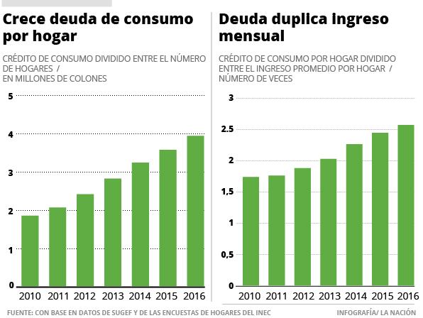 Para el cierre del 2010, cada hogar en Costa Rica tenía, en promedio, una deuda de consumo de ¢1,8 millones; en el 2016 el monto subió a más del doble, ¢3,9 millones.