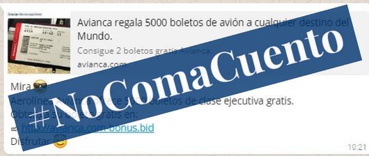 Un mensaje que redirige a un sitio donde se ofrecen boletos de avión gratis de Avianca se está compartiendo en WhatsApp. La aerolínea aclaró que la comunicación es falsa.