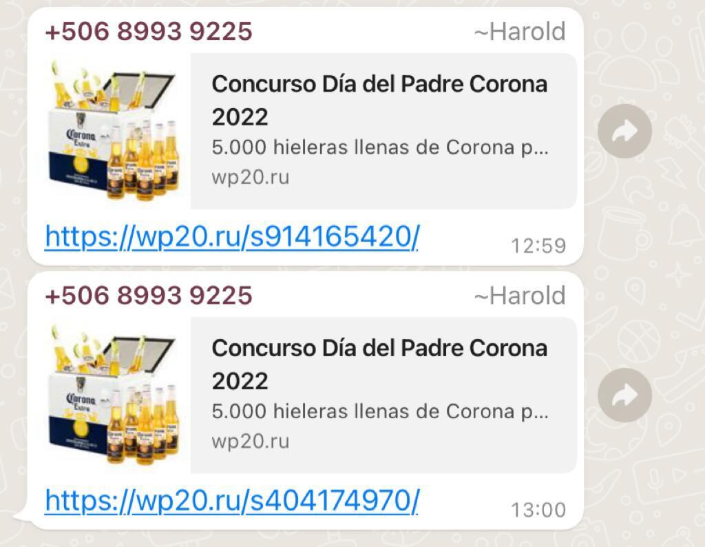 El Grupo Modelo, de México, productor de Corona, informó a sus clientes que el Concurso Día del Padre Corona 2022 contiene un virus y negó que la actividad, en la cual promete la rifa de 5.000 hieleras con cervezas, sea de la compañía. De hecho, advirtió en un mensaje publicado en Twitter que la promoción difundido en redes sociales, principalmente por WhatsApp, solo busca robar datos de la persona una vez que ingresa al link del supuesto concurso.