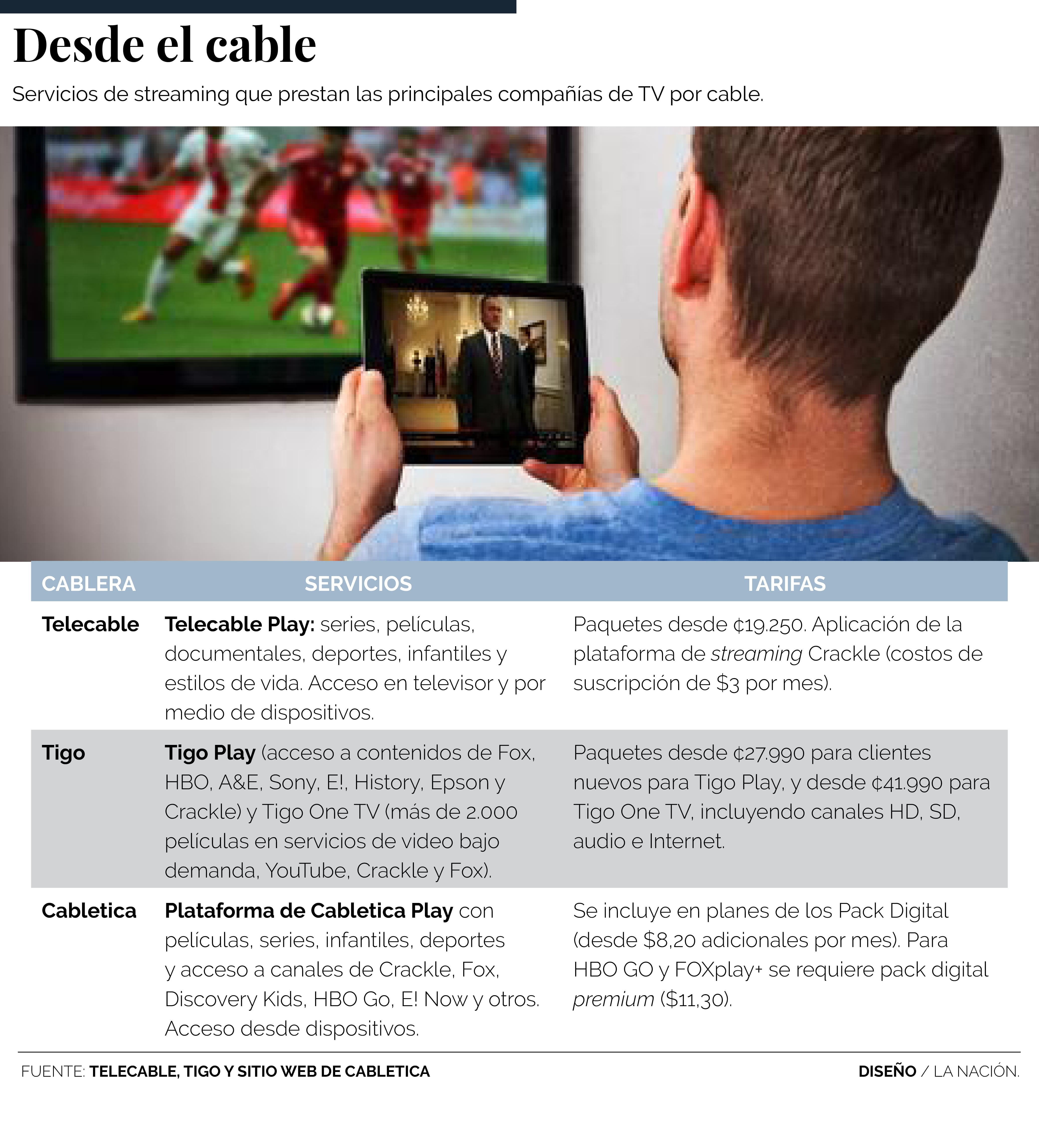 Las empresas de televisión por cable como Tigo, Telecable y Cabletica también ofrecen servicios de contenidos vía streaming en sus plataformas.