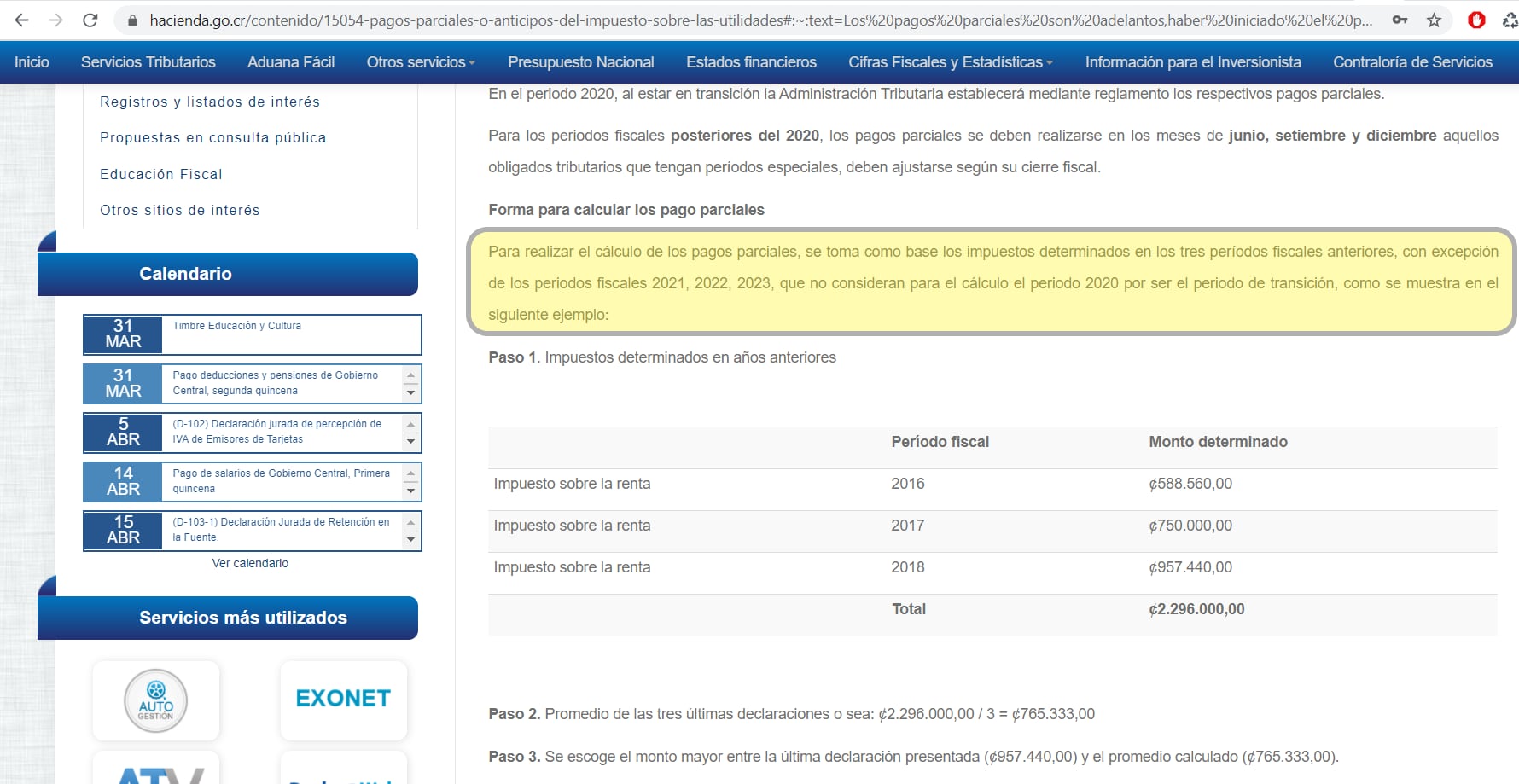 Según establece el artículo 22 de la Ley de Impuesto sobre la Renta para realizar el cálculo de los pagos parciales, se suman los impuestos determinados en los tres periodos fiscales anteriores y se dividen entre tres; se escoge el monto mayor entre la última declaración presentada y el promedio calculado. Luego, el 25% de ese resultado es el monto correspondiente a cada pago parcial.