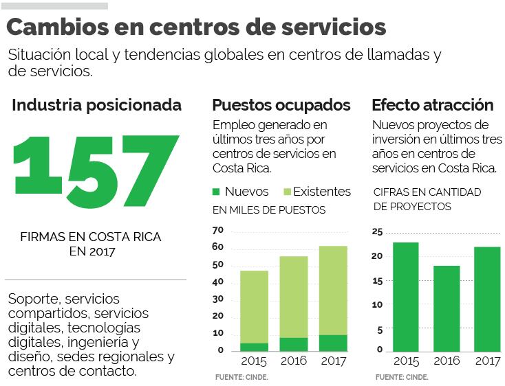 Los centros de servicio ubicados en el país, que incluyen diversos tipos de operaciones, pasaron de seis empresas a 157, del 2000 al 2017, generando, actualmente, casi 62.000 empleos, según datos de la Coalición Costarricense de Iniciativas de Desarrollo (Cinde).