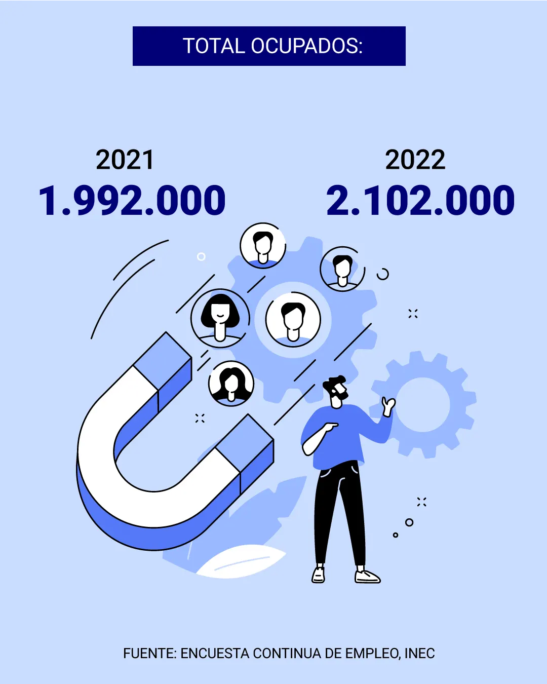 El número de ocupados, por su parte, fue de 2.102.000 personas y la cifra está compuesta por 1.290.000 hombres y 812.000 mujeres. Así, la Encuesta Continua de Empleo arroja que la población ocupada aumentó en 110.000 personas.