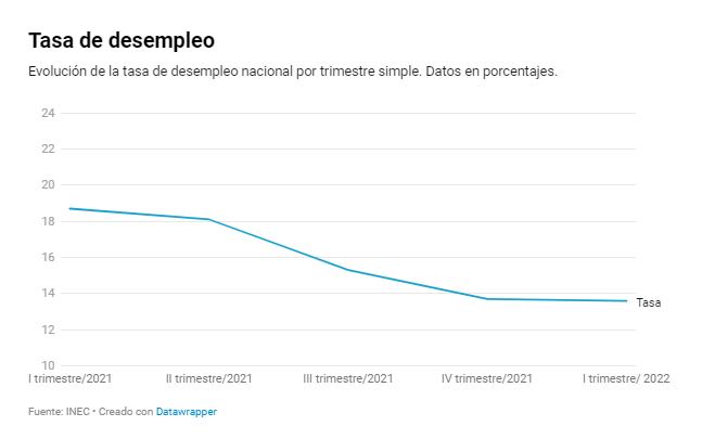 La tasa de desempleo nacional para los meses de enero, febrero y marzo del 2022 alcanzó el 13,6%, lo que significa una reducción de 5,1 puntos porcentuales (p. p) respecto al mismo periodo del 2021.