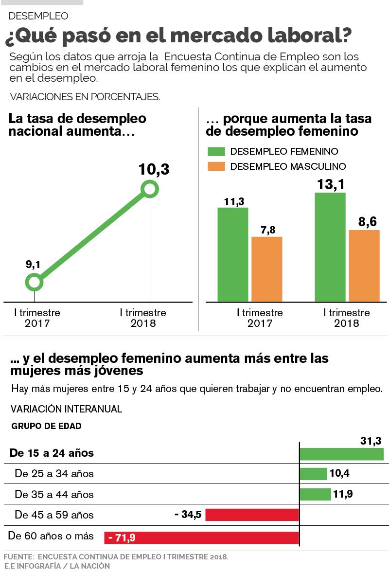 Sanarrusia detalló que el desempleo femenino aumentó especialmente entre las jóvenes de 15 a 24 años. El número de mujeres desocupadas de ese rango de edad es de casi 46.000, cerca de 11.000 más respecto al mismo trimestre del año anterior.