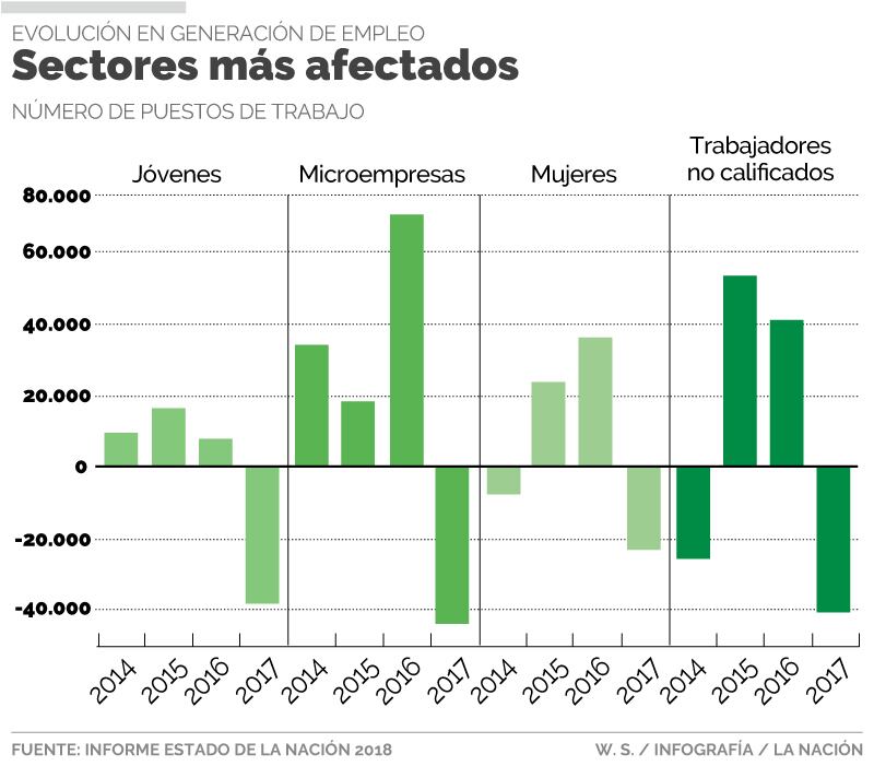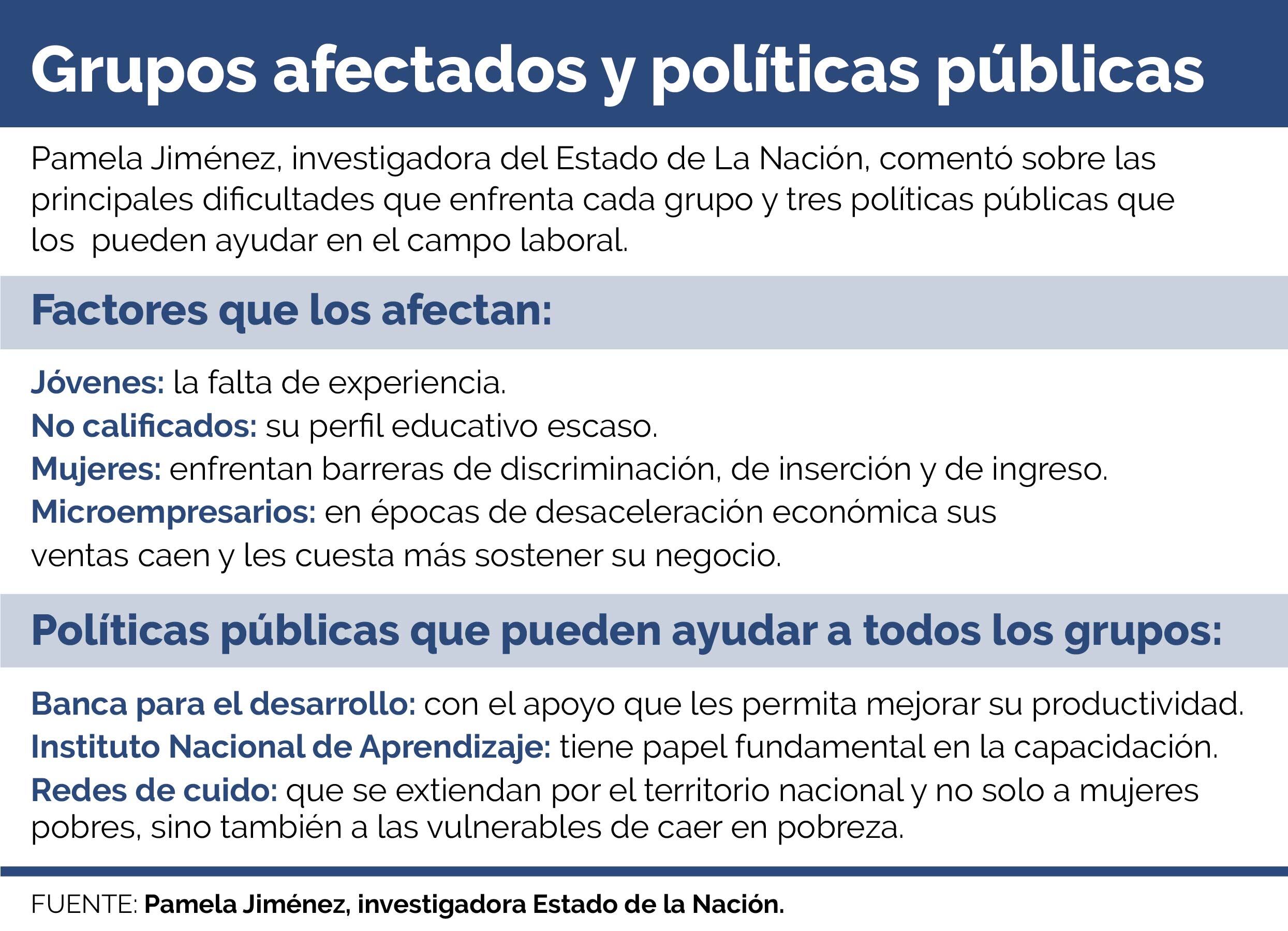 Pamela Jiménez, investigadora del Estado de La Nación, explicó que en el caso de los jóvenes lo que más les afecta es la falta de experiencia; a los no calificados su bajo perfil educativo, las mujeres tienen varias barreras de entrada al mercado laboral y a los microempresarios los golpea su capacidad para responder a periodos de desaceleración económica.