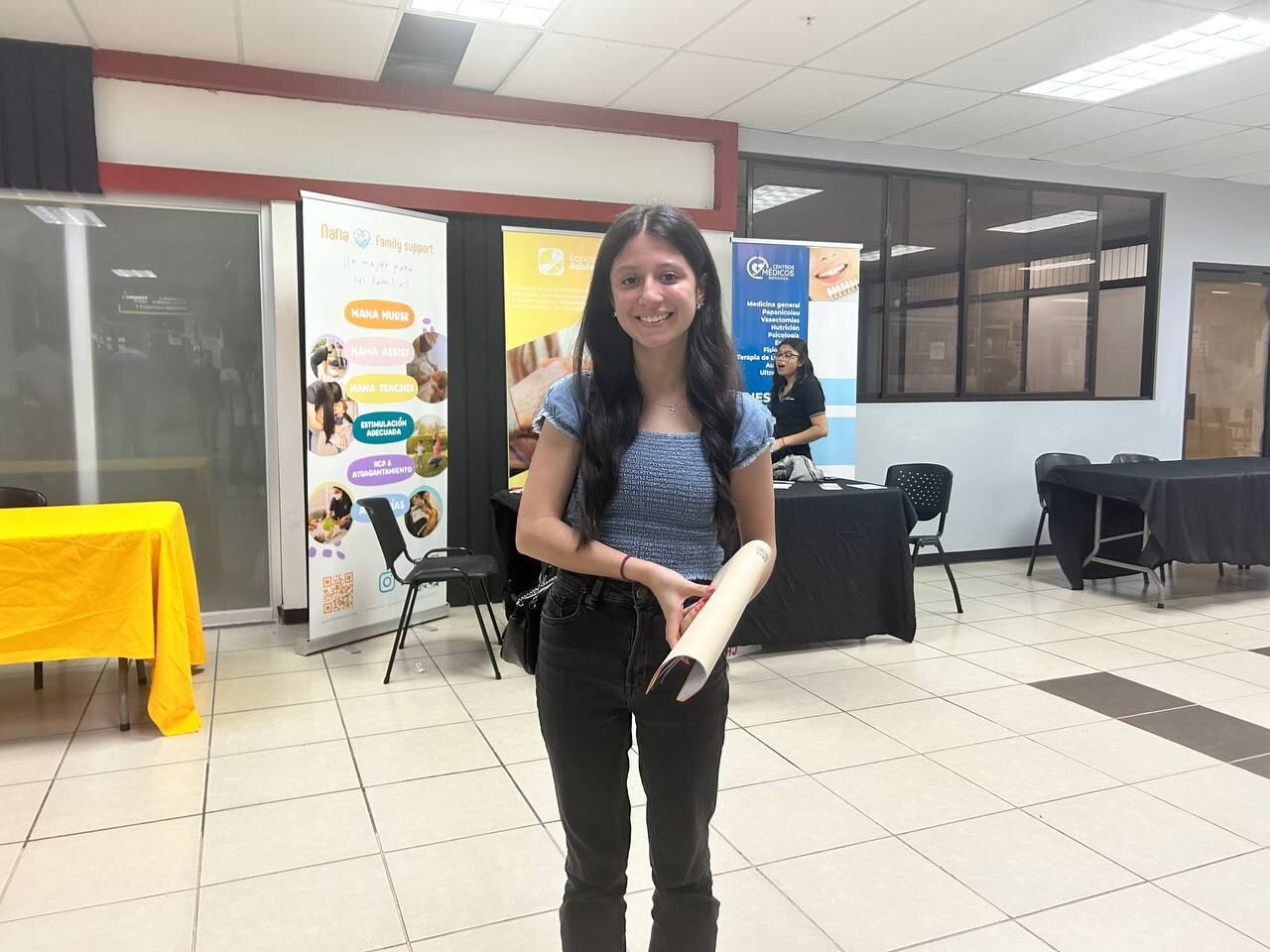 Al ingresar a una universidad, es frecuente observar a jóvenes recorriendo los pasillos con cuadernos, libros y papeles en sus manos. Pero, en medio de esta escena, destaca Ariela Carrillo Ocampo, quien, a diferencia de los demás, no es una estudiante, sino una participante en una feria de empleo que tiene lugar cerca del campus universitario.