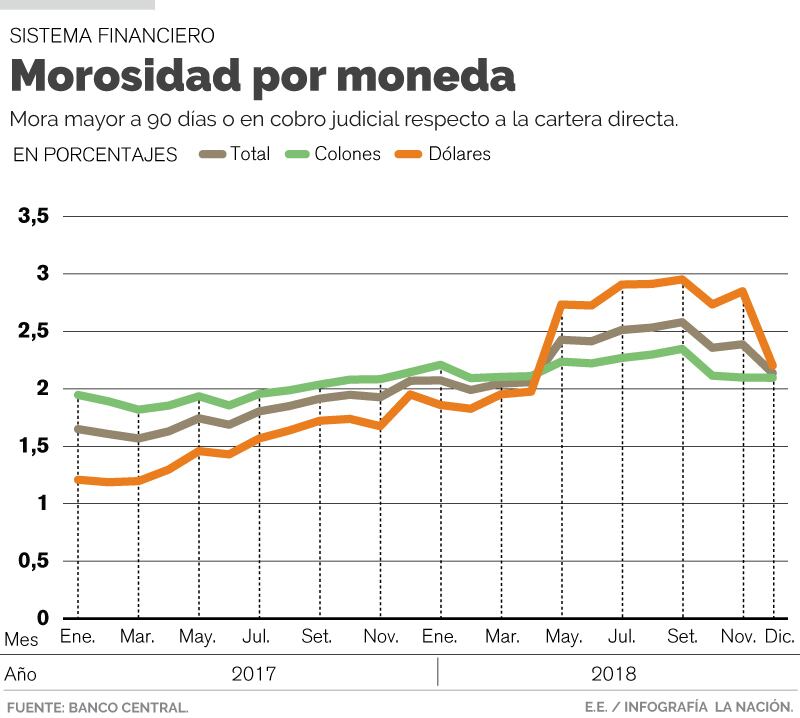 La reducción se registró tanto en los créditos en colones como en dólares. En el caso de la moneda local el indicador de morosidad pasó de 2,35%, en setiembre del 2018, a 2,10%, en diciembre de ese mismo año; y en moneda extranjera, de 2,95% a 2,20%, en ese mismo periodo.