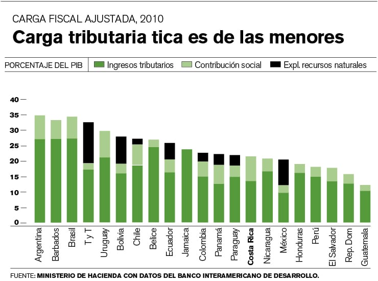 Estas y otras debilidades influyen en que la carga tributaria en Costa Rica, sumando las contribuciones sociales, ronde el 22%, entre las más bajas de la región, mientras el gasto social es de los más altos de América Latina.