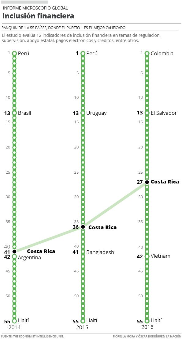 Costa Rica avanzó nueve puestos en el ranquin sobre acceso a servicios bancarios Microscopio Global 2016 hecho por The Economist Intelligence Unit.