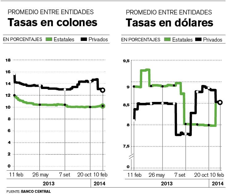 Las entidades estatales tienen una tasa promedio de 10,19% en los préstamos en colones, y los privados de 12,89%, según datos del Banco Central con fecha del 11 de febrero.