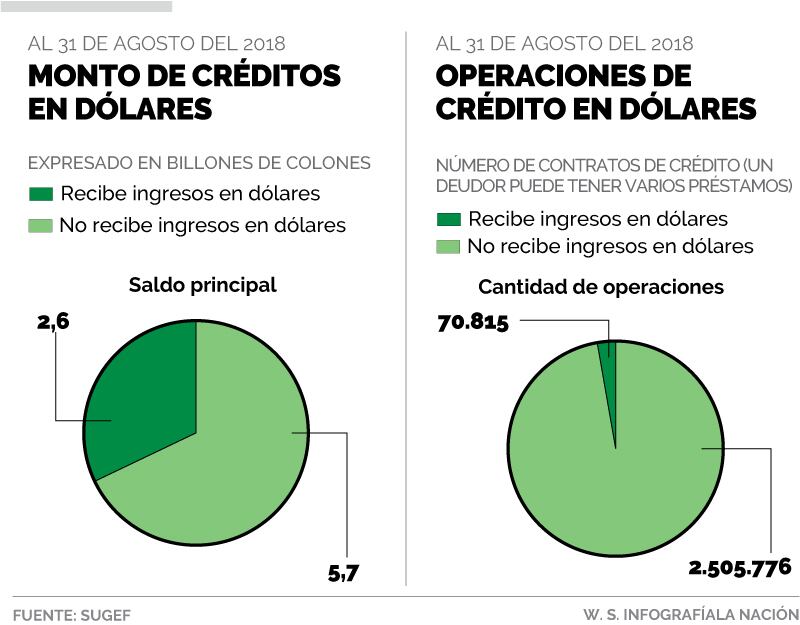 Si lo que se considera es el monto prestado, al 31 de agosto hay ¢8,3 billones (millones de millones) en créditos en dólares expresados en colones (en dólares son $14.128 millones), de los cuales el 68% corresponde a personas o empresas que no reciben ingresos en la divisa.