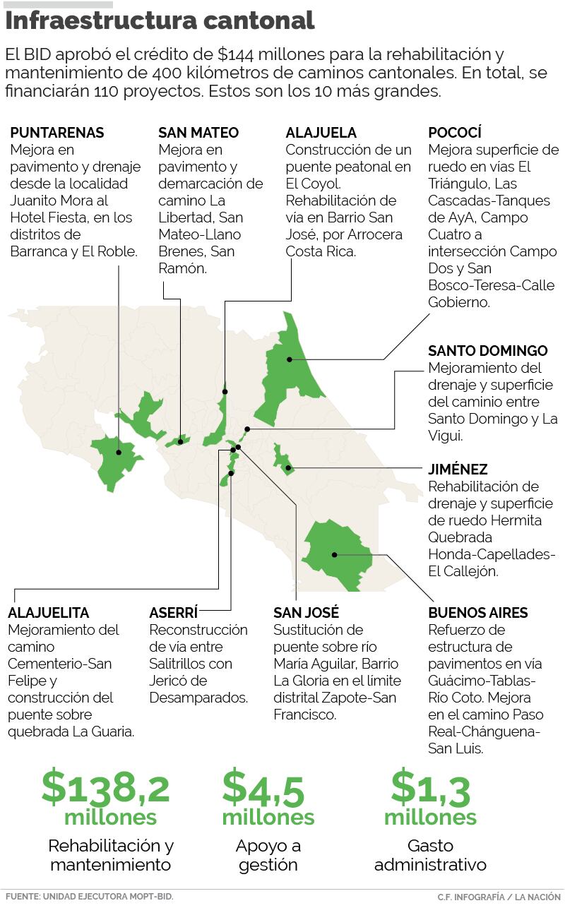Este es el segundo programa de rehabilitación de vías cantonales financiado por el BID. El primer crédito fue por $200 millones y financió 129 proyectos de mejora de caminos, puentes y alcantarillas para un total de 432 kilómetros intervenidos, según el Ministerio de Planificación Nacional y Política Económica (Mideplán).