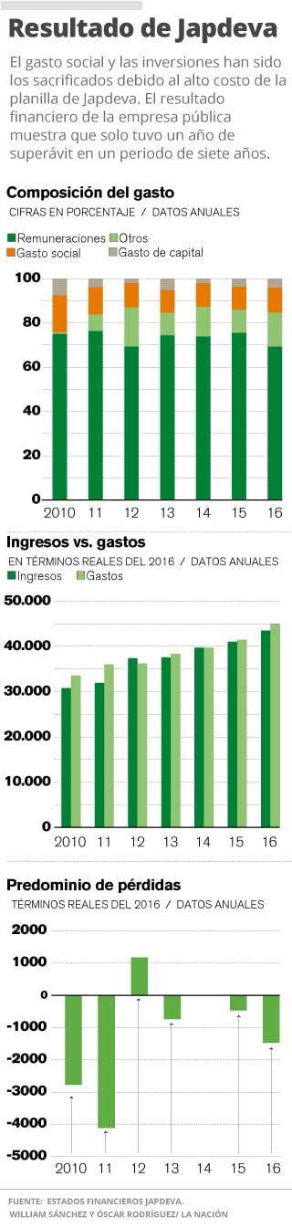El pago de salarios, fondo de ahorro y cargas sociales consumió, en el 2016, el 70% del gasto de la empresa, es decir, ¢30.150 millones, según los estados financieros de la entidad.