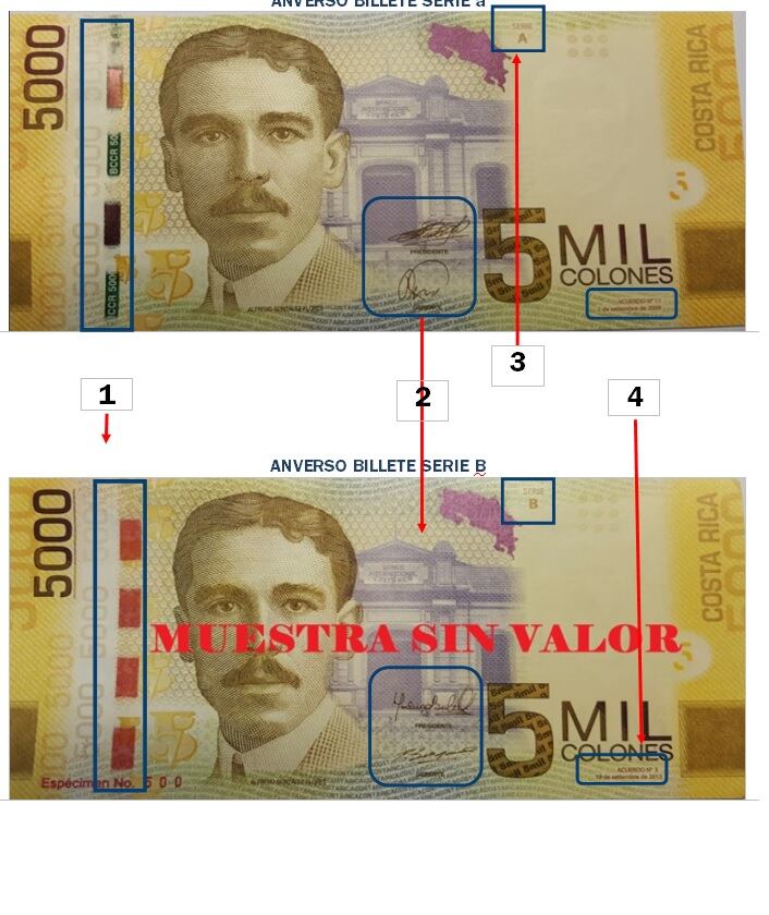 Además del hilo, los billetes de la serie B tendrán una firma diferente del presidente y del gerente del BCCR, así como la letra "B" en la serie y un número de acuerdo y de fecha de emisión diferentes en relación con la serie A. Los demás elementos de seguridad del billete se mantienen.