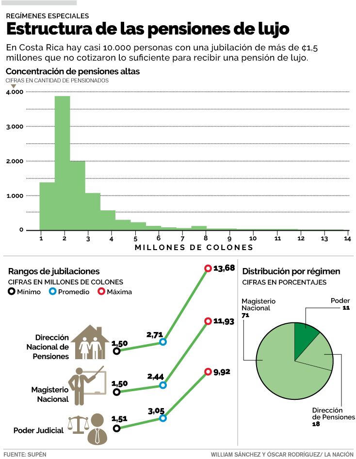 Aunque hay excepciones de jubilaciones altas como los ¢13,6 millones del régimen de Hacienda y Diputados y ¢11,9 millones del Magisterio Nacional. Aunque en ambos casos se efectúan contribuciones adicionales.