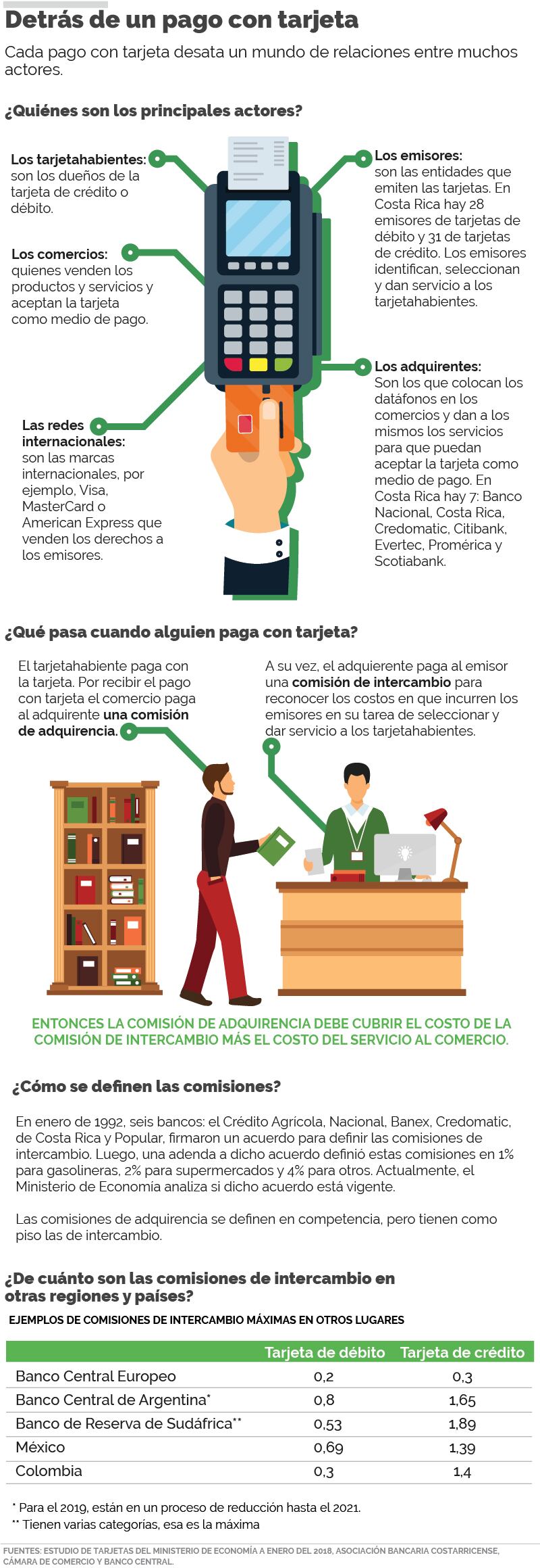 Ronulfo Jiménez, asesor económico de la Asociación Bancaria Costarricense, explicó que el pago que hace el adquirente al emisor (la comisión de intercambio) es para reconocer los costos en que incurren los emisores en su tarea de seleccionar y dar servicio a los tarjetahabientes.